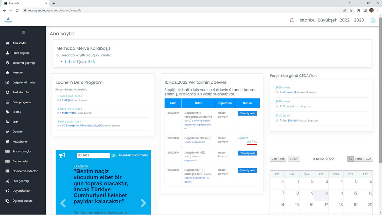 Sistem, öğrencilere haftalık olarak her branş dersinden otomatik ödevlendirme yapar. Bu ödevlerde öğrenci tarafından yapılan cevaplamaların sistem tarafından analiz edilmesi ve her sorunun çözüm videosu öğrenciye iletilir. Ödevlerde yapılan cevaplamalara göre sistem analizine uygun şekilde haftalık ders çalışma programı oluşturur. Her öğrenciye ayda 1 adet, çözüm videoları olan online deneme sınavı yapılır. Her ayın sonunda hem verilen ödevlerden hem de girilen denemeden öğrencinin yapamadığı soruları tekrar çözebilmesi için PDF olarak sıfır hata kitapçığı sistem tarafından tanımlanır. Hem günlük, hem de haftalık ödevlendirmede öğretmenler, öğrencilere özel ödevler verebilir ve hem takip hem kontrolünü yapabilirler. Günlük ya da haftalık verilen ödevleri, öğretmen, öğrenci ve veli ve kurum yöneticileri görür, raporlamaları görür. Öğrenciler derslerdeki testleri ve öğretmen tarafında ödev olarak atanan testleri çözmeleri durumunda, KVKK kapsamında ilgili veriler öğretmen, veli, idareci ve öğrenci panellerine otomatik ve online olarak aktarılır.